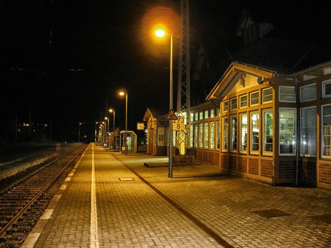 Keywords: sassnitz germany depot station platform train railroad railway buildings architecture night evening lights lighting shadows outside