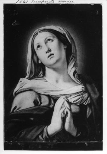 | Keywords: Sassoferrato - The Virgin In Prayer - Walters 371861.jpg The Virgin's simple garments and unadorned hair indicate her humility and the halo of light radiating from her head testifies to her sanctity and purity The regular shapes of the Virgin's features and the upturned gaze reveal Sassoferrato's study of the work of Guido Reni 1575-1642 Sassoferrato however uses more simplified forms than Reni as well as a reduced color scheme This simplicity of style was intended to convey piety Some of the artist's renderings of the subject were meant as pendants or companion paintings to images of Christ as the Savior of the World Salvator Mundi following a northern European type Zeri Italian paintings in the Walters Art Gallery 323 450-451 1630-80 Baroque Oil on canvas Painted surface cm 61 8 45 4 ; Framed cm 81 28 68 58 3 81 accession number 37 1861 15971 Agostini Family Sassoferrato date and mode of acquisition unknown Don Marcello Massarenti Collection Rome date and mode of acquisition unkonwn 1881 catalogue no 144 1897 catalogue no 255 Henry Walters city Baltimore Walters Art Museum Henry Walters Acquired by Henry Walters with the Massarenti Collection 1902 place of origin Rome Italy Walters Art Museum license 2D Baroque paintings in the Walters Art Museum Il Sassoferrato Media contributed by the Walters Art Museum needs category review |