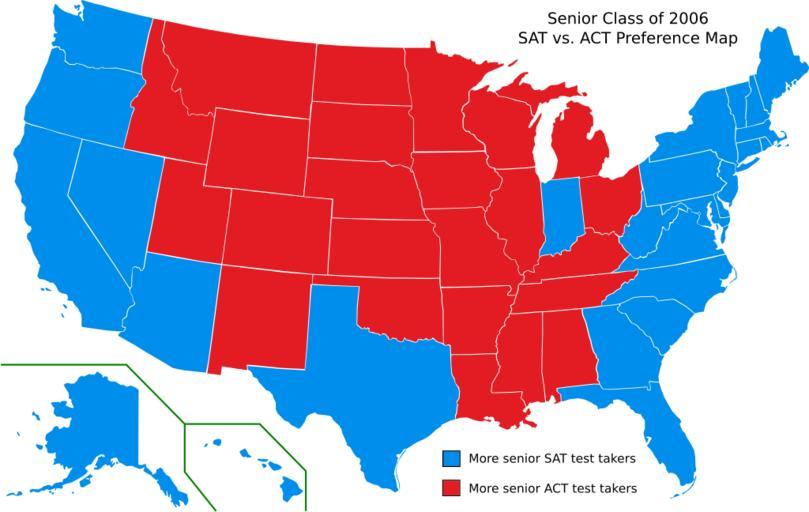 | Keywords: SAT-ACT-Preference-Map-2006.svg en This map of the United States shows the states in which blue color more seniors took the SAT than the ACT and the states in which red color more seniors took the ACT than the SAT The blue and red colors were selected to match the logos of the College Board and ACT Inc respectively Data is for the senior class of 2006 Sources College Board 2006 State Profile Reports; ACT Inc 2006 State Profile Reports 2014-03-16 12 11 48 own This file is a modified version of the public domain file SAT-ACT Preference Map Erik Jacobsen http //erikthered com/tutor erikthered com cc-zero Uploaded with UploadWizard Statistical charts SAT test |