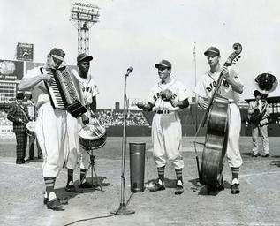 Keywords: band music musicians home plate homeplate 1951 outdoor blackandwhite black and white St. Louis Browns, Sportsman's Park, 1951. Others in the photo are: coach Ed Redys on accordion. infielder (and later soap opera actor) Johnny Berardino on maracas/conga, and pitcher Al Widmar on bass. St. Louis Browns, Sportsman's Park, 1951. Others in the photo are: coach Ed Redys on accordion. infielder (and later soap opera actor) Johnny Berardino on maracas/conga, and pitcher Al Widmar on bass.