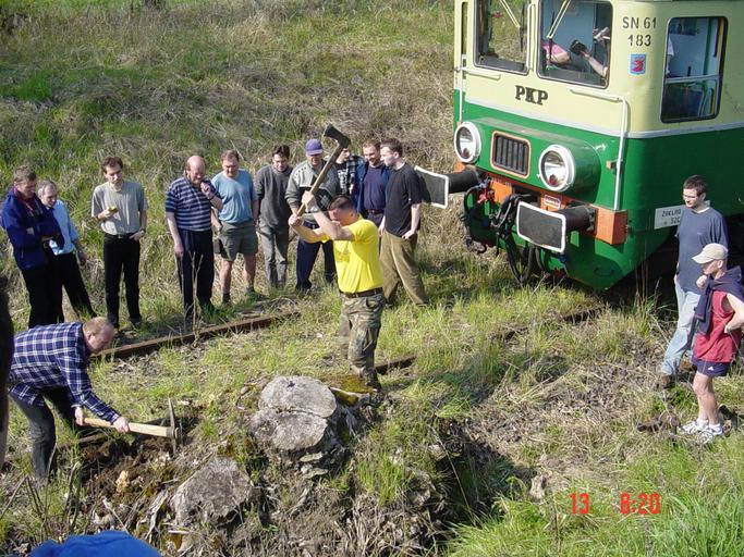 | Keywords: Satopy stub removal from track.JPG route 261 outside Sątopy Samulewo in Poland Picture shows diesel railcar SN61 and several organizers and participants of a tour for railfans along disused tracks of North-East Poland in spring 2003 2003-05-13 own Previously published with low resolution on http //railtrips euweb cz/c_maz_foto35 html Jan Pešula cc-zero Uploaded with UploadWizard Railway line 261 Poland Sątopy-Samulewo SN61 of PKP | ||||