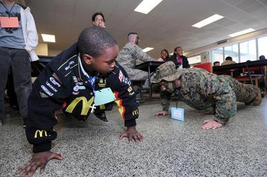 | Keywords: Saturday Scholars DVIDS155605.jpg en A West Pensacola Elementary School Saturday Scholar student who says he wants to become a Marine does push-ups with Saturday Scholar mentor Pfc Kayla McCracken from Longview Texas during the final weekend of mentoring for the 48th session of Saturday Scholars hosted by Center for Information Dominance Corry Station 2009-02-21 Gary Nichols https //www dvidshub net/image/155605 090221-N-+++++-119 2009-03-08 05 45 PENSACOLA FL US PD-USGov-Military-Navy Push-ups Images from DoD uploaded by Fæ |