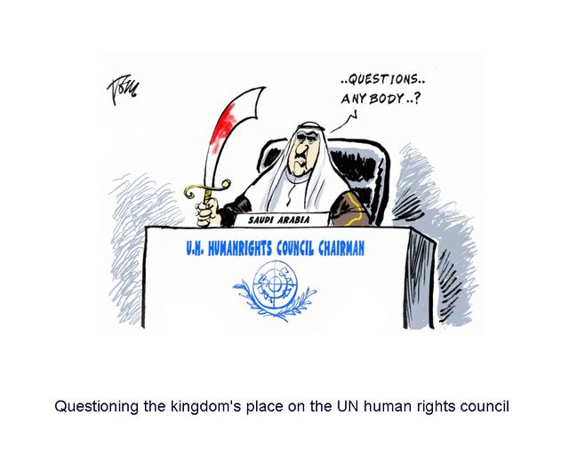 Keywords: cartoon un saudi politics voting human rights humanrights ridiculous illustration text Cartoons taunting Saudi Arabia's membership of the United Nations human rights council have gone viral on social media after the kingdom executed 47 people in one day. While the regime's interior minister claimed most of the 47 executed had been involved in the deadly 2003 and 2004 al-Qaeda attacks, a prominent Shia cleric, Sheikh Nimr al-Nimr, was also put to death. He was a vocal supporter of the mass anti-government protests that flared up in the kingdom's Eastern Province in 2011. Cartoons highlight anger at Saudi Arabia's position as head of key UN human rights panel Some social media users have started questioning the kingdom's place on the UN human rights council Ashley Cowburn Sunday 3 January 2016 www.independent.co.uk/news/world/middle-east/saudi-arabia... Cartoons taunting Saudi Arabia's membership of the United Nations human rights council have gone viral on social media after the kingdom executed 47 people in one day. While the regime's interior minister claimed most of the 47 executed had been involved in the deadly 2003 and 2004 al-Qaeda attacks, a prominent Shia cleric, Sheikh Nimr al-Nimr, was also put to death. He was a vocal supporter of the mass anti-government protests that flared up in the kingdom's Eastern Province in 2011. Cartoons highlight anger at Saudi Arabia's position as head of key UN human rights panel Some social media users have started questioning the kingdom's place on the UN human rights council Ashley Cowburn Sunday 3 January 2016 www.independent.co.uk/news/world/middle-east/saudi-arabia... |