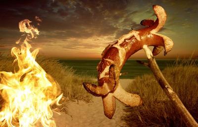 Keywords: sausage red insert barbecue fried campfire fire beach sand water lake evening