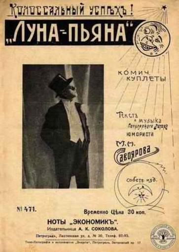 Keywords: Savoiarov M.N. Luna.jpg en Le Roi de Excentrique - russian poet composer chansonie Mikhail Savoiarov ru Ко оль эксцент ики - поэт композито певец и мим ихаил Савоя овъ - обложка нот его самой знаменитой песенки 1915 года кото ую аспевал весь Пет ог ад archives de --FinitoR Originally uploaded in ruwiki by ru Участник Финито as ru Savoiarov_M N _Luna jpg unknown pre-revolutionary Polygraph ~ 1916 PD-old Compositions by Mikhail Savoiarov |