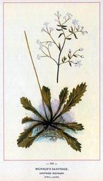 | Keywords: Saxifrage michauxii chromolithograph.jpg Micranthes petiolaris Saxifraga petiolaris chromolithograph print from the 1894 edition of Wild Flowers of America prepared by Botanical Fine Art Weekly Published by G H Buek Co NY Scan of original 1894 Botanical Fine Art Weekly PD Text from the reverse side of the plate PLATE 248 MICHAUX'S SAXIFRAGE SAXIFRAGA MICHAUXII LEUCANTHEMIFOLIA SAXIFRAGE FAMILY Perennial; with a short rootstock; stem erect hairy much branched; root-leaves rosulate on long hirsute petioles obovate or spatulate stem-leaves short-petioled uppermost bract-like all coarsely laciniate-toothed; flowers in open compound cymes; petals five white three of them heart-shaped at base the other two narrowed; fruit two divergent follicles Saxifrages are not very well-known plants though abundant in temperate regions in every part of the World That is there is very little of poetry and sentiment associated with them--they have missed the written word that gives fame her wings One European species is in the language of flowers the symbol of affection Doubtless because this kind makes its home on mossy rocks nestling in the clefts this idea has become associated with it Why not give the same meaning to our own rock-growing species Weighty if unacknowledged is the debt of America to the explorers the men of science of France Of this debt the plant before us serves as a remembrancer Saxifraga Michauxii is named after the sturdy French collector and traveler whose name is so intimately connected with North American plant-lore A large proportion of our native plants received names at the hands of this old voyageur Especially is this the case with the flora of the mountain region of the South Michaux himself named this Saxifrage Leucanthemifolia; but as that name had already been given to another species this one has been recently entitled Saxifraga Michauxii It is a small plant growing in cool springy places in the mountains from Georgia to Virginia and straying northward The leaves are deeply cut though the resemblance to those of the White-weed which Michaux saw when he named the plant Leucanthemifolia is not very striking The flowers are white rather large for a Saxifrage PD-old Micranthes petiolaris Chromolithographs |