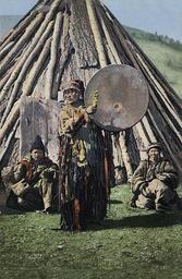 | Keywords: SB - Altay shaman with drum.jpg Алтайский шаман с бубном на фоне т адиционного жилища - чаады Altajse sjamaan met een tamtam met op de achtergrond een tsjaadyr traditionele woonplaats Image of a postcard issued in Russian Empire early 20<sup>th</sup> century Its original texts says in french Un chaman sorcier d'Alatai it can be rendered as A shaman sorcerer of Altai in English It can be seen also in museum of Tomsk The ethnographer Hoppál identifies the shaman woman to be of Altai Kizhi or Khakas origin admitting that it cannot be decided exactly from the image alone which of the two <ref>Hoppál 2005 77 287</ref> The ethnographic photo itself after which the postcards were issued had been taken by ethnographer S I Borisov in 1908 <ref>Znamensky 2005 128</ref> Note that the standing woman is holding a shaman's drum not a gong Image d'une carte postale de l'Empire russe du début du XX e siècle Son texte original écrit en français « Un chaman sorcier d'Alatai » Alatai faisant référence à l'Altaï Cette image peut également être vue au musée de Tomsk L ethnographe Hoppál attribue à la femme chaman une origine Kizhi de l'Altai ou Khakasse tout en admettant que l'image seule ne permet de décider précisément laquelle<ref>Hoppál 2005 77 287</ref> La photo ethnographique d'après laquelle la carte postale a été créée a été prise par l'ethnographe S I Borisov en 1908 <ref>Znamensky 2005 128</ref> La femme debout porte un tambour de chaman et non pas un gong http //www sibheritage nsc ru/index php id 2691 showcoll 73 f 1 media 4 taken between 1911 and 1914 Creator Sergei Ivanovich Borisov PD-old RECCE SİKER ZAA References <references /> on the book in Hungarian cite book Znamensky Andrei A Az ősiség szépsége altáji török sámánok a szibériai regionális gondolkodásban 1860 1920 117 134 Molnár Ádám Csodaszarvas Őstörténet vallás és néphagyomány Vol I Molnár Kiadó Budapest 2005 963 218 200 6 Hungarian The chapter means Beauty of anciency Altai Turkic shamans in Siberian regional thinking 1860 1920 ; the book title means Miracle deer Ancient history religion and folklore tradition Shamanism History of the Altai Republic Sergei Ivanovich Borisov Akadémiai Kiadó Postcards of the Russian Empire |