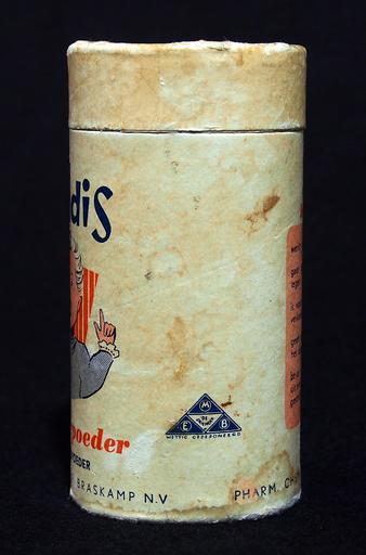 Keywords: Scaldis kinderpoeder busje, foto2.JPG Very old packaging of a Dutch product that is not produced and/or not sold any more own 2014-03-16 12 36 17 Alf van Beem CC-Zero Trademarked Talcum powder
