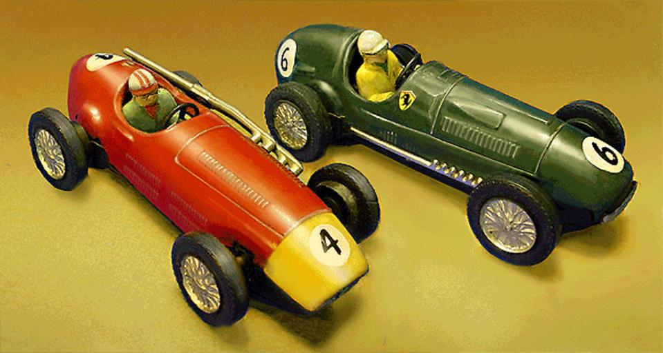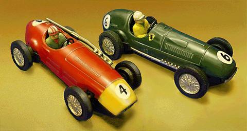| Keywords: Scalextric-Tin-Cars-restored.png en Very early Scalextric slot car models in 1 30 scale circa 1957 These pressed-steel-bodied racers were electric adaptations of Scalex clockwork-powered cars and are among the first commercially-offered slot cars of the modern era They represent the Maserati F250 left and the Ferrari 375 Grand Prix cars My own work based on downloaded photos see Additional Info below D Helber 2008-07-15 This image was created by me in Photoshop CS Version 8 It is a heavily modified combination of two separate photos from an auction site The original subjects of the photos were damaged and partially rusted examples I used them as a basis for a photo-restoration to show the models in original condition Modifications include corrections of dirt and discoloration rust spots dents missing and peeling paint; addition of missing parts; entirely new background; combination of two single image photos into one dual-image photo; perspective correction extensive modification of highlights to clarify form and for aesthetics This constitutes substantial modification of the original images in fact there is hardly an original pixel remaining on the bodies of the cars and as such constitutes a new work under US copyright law Scalextric Maserati model cars Ferrari F1 car model cars Maserati 250F |