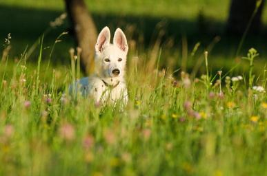 Keywords: schäfer dog white shepherd puppy animal children flowers flower meadow
