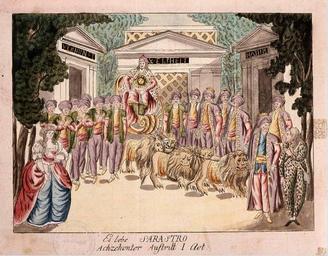 | Keywords: SchafferBrothersDesignForMagicFlute1793ArrivalOfSarastro.png The Magic Flute in Brno in 1793 The triumphal arrival of the high priest Sarastro on a chariot pulled by several lions is depicted near end of Act I 1793 http //www habsburger net/en/media/joseph-and-peter-schaffer-magic-flute-act-i-scene-18-now-25-c-1793-coloured-copperplate Joseph and Peter Schaffer 1793 other versions PD-1923 This is part of a set of six images depicting a 1793 performance in Brno now in the Czech Republic of Mozart's opera The Magic Flute This was not the premiere Vienna 1791 but is the first performance from which documentary images survive The triumphal arrival of the high priest Sarastro on a chariot pulled by lions is depicted The libretto calls for six lions; it is not clear from the image whether the Brno production succeeded in fulfilling this specification In the background appear three temples bearing the German inscriptions Vernunft Weisheit and Natur reason wisdom nature In the right foreground is Papageno identifiable by his feather-textured costume and pipes The female character at the far left is almost certainly the heroine of the opera Pamina There is a chorus of priests and acolytes Sarastro bears an image of the sun on his breastplate The caption reads Es lebe Sarastro Long live Sarastro the opening words sung by the chorus in this scene; along with designation of Scene 18 Act I For more information see source page http //www habsburger net/en/media/joseph-and-peter-schaffer-magic-flute-act-i-scene-18-now-25-c-1793-coloured-copperplate PD-Art Die Zauberflöte Opera productions |