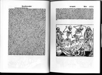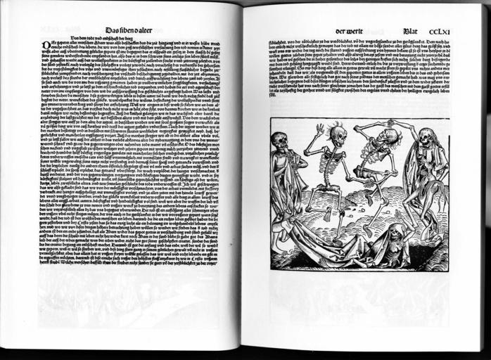 Keywords: Schedelsche Weltchronik d 261.jpg 260 262 Tanz der Gerippe in Schedel ™sche Weltchronik S 261 Das siebte Zeitalter der Welt nach Christlich-mittelalterlichen Verständnis; Hozschnitt von Michael Wolgemut