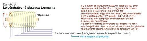 | Keywords: SchemaOrgueAnalogique.png fr Schéma montrant le principe de fonctionnement de l'orgue analogique à plateaux rotatifs en Diagram showing the operating principle of analog organ with rotating disks e g optical tone wheel organ etc dessin personnel réalisé en 2002 A Moïra Check categories 2009 May 2 fr wikipedia Technologies_comparées_des_orgues_électroniques Pipe organ 4 Lichtton orgel Optical tonewheel organs Electronic musical instruments Organ schematics ImageNote 1 1278 62 1044 439 2345 659 2 fr <br/> Schéma montrant le principe de fonctionnement de l'orgue analogique à plateaux rotatifs L'ancêtre Le générateur à plateaux tournants Il y a autant de fils que de notes 61 notes par jeu pour des claviers de 61 notes Sur un orgue à trois claviers de 50 jeux il faut donc compter 3050 fils Le même plateau engendre 5 octaves l'astuce consistant à lire le plateau entier 1/2 plateau 1/4 1/8 et 1/16 Mixtures ou jeux composés correspondent chacun à un seul jeu de plateaux Ce sont les contacts des claviers qui dirigent les sons vers l'amplification Les moteurs qui font tourner les plateaux sont bruyants et génèrent du bruit fond dans les HP 12 notes > vers les claviers qui agissent comme de simples interrupteurs <br/> Vers mixages et amplification en <br/> Diagram showing the operating principle of analog organ with rotating disks e g optical tone wheel organ etc The ancestor The generator with rotating disks There are as many wire as of notes 61 notes per tone or stop for keyboards of 61 notes On a three manual organ with 50 tones or stops it is thus necessary to count 3050 wire The same plate generates 5 octaves an easy way consisting in reading the whole plate 1/2 plate 1/4 1/8 and 1/16 Made up mixtures or plays correspond each one to only one set of plates They are the contacts of the keyboards which direct the sounds towards l' amplification The engines which make turn the plates are noisy and generate noise melts in the HP 12 notes > towards the keyboards which act like simple switches Towards mixings and amplification ImageNoteEnd 1 |