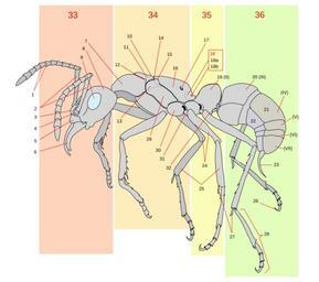 | Keywords: Scheme ant worker anatomy-numbered.svg Anatomy scheme of a worker ant Pachycondyla verenae Ст оение абочего му авья Pachycondyla verenae 1 жгутик усика 2 скапус усика 3 лобные лопасти 4 усиковая ямка 5 наличник 6 мандибулы 7 п онотум 8 затылок 9 сложный глаз 10 заднеспинка 11 мезонотум 12 с еднег удное дыхальце 13 анэписте нит 14 заднеспинка 15 заднег удное дыхальце 16 п оподеум 17 п оподеальное дыхальце 18 метаплев альная железа 18a шишка 18b отве стие 19 петиоль 20 пост-петиоль 21 те гиты б юшка 22 сте ниты б юшка 23 жало 24 бед о 25 голень 26 коготок 27 шпо а 28 лапка 29 катэписте нит 30 тазик 31 ве тлуг 32 вент альный от осток Schéma anatomique d'une fourmi ouvrière Pachycondyla verenae Légende de l'image 1 funiculus 2 scape 3 lobes frontaux 4 fosse antennaire 5 clypeus 6 mandibules 7 pronotum 8 occiput 9 œil composé 10 scutellum 11 mesonotum 12 spiracle mésothoracique 13 anepistemum 14 metanotum 15 spiracle mésothoracique 16 propodeum 17 spiracle propodéal 18 glande métapleurale 18a bulla 18b orifice 19 pétiole 20 postpétiole 21 tergite 22 sternite 23 aiguillon 24 fémur 25 tibia 26 griffe 27 éperon tibial 28 tarse 29 katepisternum 30 coxa 31 trochanter 32 processus ventral Telesna zgradba mravlje delavke vrste Pachycondyla verenae 1 tipalnica - funikel 2 tipalnica - kolence 3 sprenji reženj glave 4 jamica za tipalnico 6 mandibula 7 predprsje pronotum 9 sestavljeno oko 10 ščitek skutelum 11 sredoprsje mezonotum 12 mezotorakalni spirakel vzdušnična odprtina 14 zaprsje metanotum 15 metatorakalni spirakel 18 metaplevralna žleza 18a bula 18b izvodilo 19 petiol 20 postpetiol 21 tergit 22 sternit 23 želo 24 stegence 25 golence 26 tarzalni krempelj 28 stopalce 30 kolček 31 obrtec 32 ventralni odrastek 33 glava 34 mezosoma 35 pedicel 36 metasoma Own work Image renamed from Image Ant worker morphology numbered svg 2006-06-24 Mariana Ruiz User LadyofHats LadyofHats Other versions/Scheme ant worker anatomy Formicidae whole external body views with legends Language-neutral diagrams SVG insect anatomy |