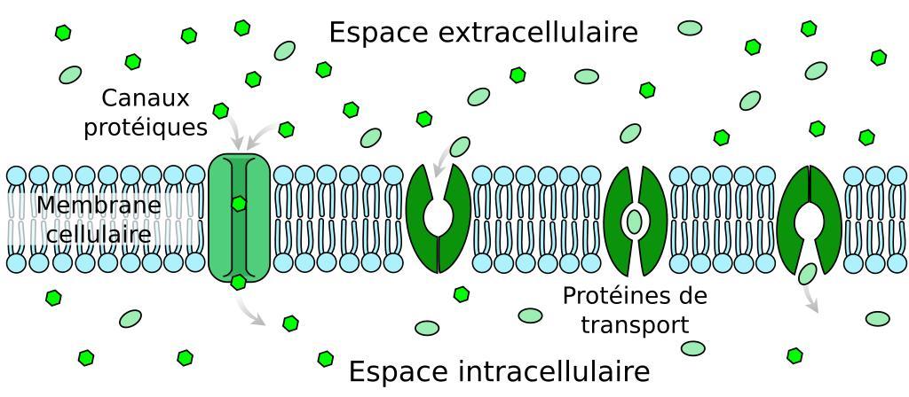 | Keywords: Scheme facilitated diffusion in cell membrane-fr.svg  Le transport facilité implique l'utilisation de protéines pour faciliter le mouvement de molécules à travers la membrane Dans certains cas les molécules passe à travers un canal protéique Dans d'autres cas la protéine de transport change de conformation permettant le passage de la molécule Translation of Image Scheme facilitated diffusion in cell membrane-en svg 2007-02-04 English original ; 2010-09-15 French translation LadyofHats Mariana Ruiz English original ; Vaderf French translation LadyofHats Other versions/Scheme facilitated diffusion in cell membrane translation possible Ultrastructure diagrams SVG diagrams in French Membrane transport |