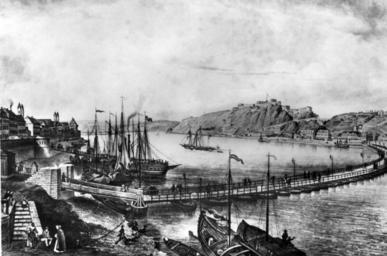 | Keywords: Schiffbrücke Koblenz 1850.jpg de Schiffbrücke in Koblenz um 1850 mit Blick auf Ehrenbreitstein Sammlung alter Stiche author um 1850 eingescannt am 3 Juni 2012 von Frila <span class signature-talk >talk</span> 19 31 3 June 2012 UTC Floating bridge in Koblenz Koblenz in the 19th century PD-Art |