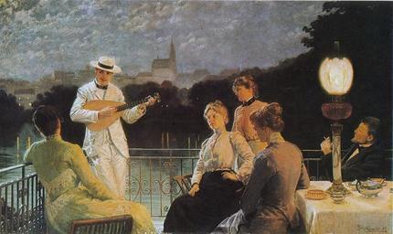 Keywords: Schikaneder.jpg Company on the Terrace oil on canvas 80 x 130 cm Středočeská galerie v Praze signature lower right 1887 Creator Jakub Schikaneder n PD-old-auto 1924 Jakub Schikaneder Lutenists in art 1887 paintings Parties in art