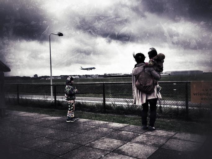 Keywords: schiphol airport airline mother children plane clouds stormy windy