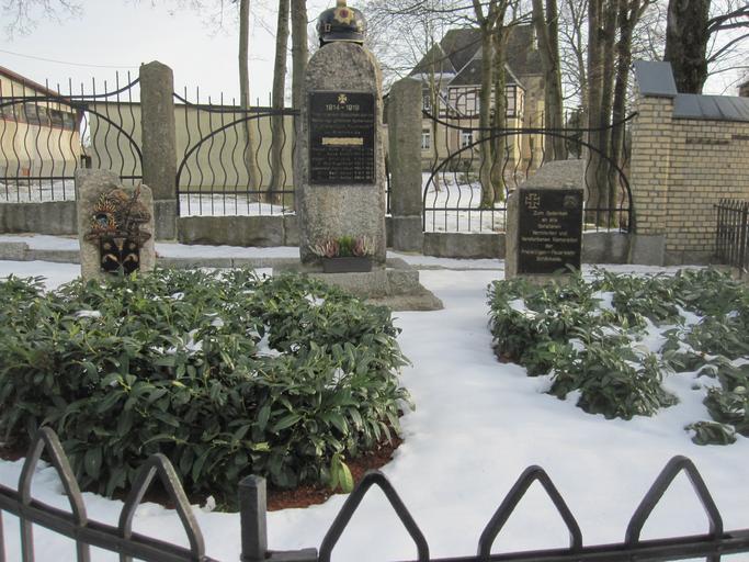 | Keywords: Schönheide im Erzgebirge Feuerwehrdenkmal 2013.jpg de Das nach dem Ersten Weltkrieg errichtete Feuerwehrdenkmal an der Ecke Hauptstraße/Schneeberger Straße erinnert an die in diesem Krieg gefallenen Mitglieder der Feuerwehr Das Denkmal wurde mehrfach umgestaltet In den 2000er Jahren war die Tafel mit den Namen der Opfer des Ersten Weltkrieges entfernt worden Auf dem Granitstein in der Mitte war die jetzt auf dem Foto rechts zu sehende Tafel mit einem allgemein gehaltenen Gedenktext angebracht worden Er lautet žZum Gedenken an alle Gefallenen Vermissten und Verstorbenen Kameraden der Freiwilligen-Feuerwehr Schönheide sic Im Jahr 20013 wurde im Zuge einer Umgestaltung der mittlere Stein durch zwei neue ergänzt auf dem linken ist eine Eisengusstafel mit Feuerwehrsymbolen und auf dem rechten die vorstehend zitierte allgemeine Gedenktafel angebracht Der Text der ursprünglich einzigen Tafel ist wieder auf dem mittleren Stein zu lesen žZum ehrenden Gedenken der im Weltkriege gefallenen Kameraden der šFreiwilligen Feuerwehr ˜ zu Schönheide Pionier Kurt Klug + 16 9 1914 Pionier Hans Hertel + 20 4 1915 Steiger Arno Lenk + 8 9 1914 Steiger Paul Engelhardt 30 7 1915 Löschmann Herm Hösel 24 7 1915 Löschmann Karl Seidel 9 7 1915 Löschmann Emil Seidel 20 4 1917 Ob diese Tafel ein Neuguss ist oder die originale Tafel aus der Entstehungszeit des Denkmals ist bei einer Ortsbesichtigung nicht zu erkennen own Klaaschwotzer 2013-12-03 Feuerwehrdenkmal Schönheide Cc-zero |