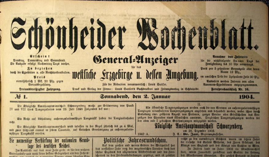 | Keywords: Schönheide im Erzgebirge Schönheider Wochenblatt 1 von 1904.jpg Schönheide im Erzgebirge “ Seit 1876 erschien das Schönheider Wochenblatt Vom Ende des 19 Jahrhunderts bis zum Einstellen des Erscheinens im Zweiten Weltkrieg im Frühjahr 1942 kam das Blatt drei Mal in Woche heraus dienstags donnerstags und sonnabends Wie oft in der Woche die Zeitung in der Zeit zwischen 1876 und um die Wende zu 1900 herauskam ist wahrscheinlich nicht bekannt Erhalten haben sich die Jahrgänge seit Ende des 19 Jahrhunderts Es erschien in der genannten Zeit im sog Berliner Format war also gut DIN A 3 groß Das Schönheider Wochenblatt hatte nach dem Ende des Zweiten Weltkrieges im Mai 1945 eine kurze Renaissance bis zur à bernahme des von Kriegsende am 8 Mai 1945 bis Ende Juni 1945 von den Alliierten nicht besetzten Gebietes durch die Rote Armee Der sowjetische Militäradministration verbot das weitere Erscheinen dieses Blattes wie der anderen Zeitungen die nicht durch die Militärverwaltung und die von ihr eingesetzten Behörden kontrolliert wurden Erst Ende 1989 ergriff Eberhard Mädler die Initiative und schuf das Schönheider Wochenblatt neu 2014 erscheint es im 25 Jahrgang der neuen Zählung seit 1989 Foto Dies ist der obere Teil des Titelblatts der ersten Ausgabe des Jahres 1904 own Klaaschwotzer 1904 Historical documents of Schönheide Historical documents of Schönheiderhammer Schönheider Wochenblatt Cc-zero |