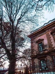 Keywords: school building old building old tree blue sky sunset window facade fence fence top austria wiener neustadt brick brown