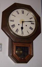| Keywords: Schoolhouse Regulator Pendulum Clock.jpg en This is a high-resolution photograph of my wind-up spring-driven Schoolhouse-regulator style mechanical pendulum wall clock The clock was running at the time I took this picture The yellow circle around the center of the dial is not original after years of people using their fingers to set the time on the clock the natural skin oils on their fingers have caused the dial to yellow over the years Own Retro00064 2008-10-29 Schoolhouse regulator Time 06 13 Clocks with Roman numerals |
