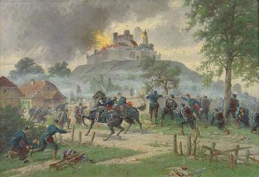 | Keywords: Schott Tod des Oberleutnants Staiger bei Lichtenberg.jpg Bombardment of the Château de Lichtenberg Lichtenberg Bas-Rhin France by Württemberg artillery which occurred on 7-9 August 1870 during the course of the w Franco-Prussian War 1870-71 The bombardment left the fortress in ruins August 1870 Technique oil canvas photo date K von Schott Der Anteil der Württemberger am Feldzug 1870/71 immediate source http //www auktionshaus-rieber de http //www auktionshaus-rieber de/ photo license PD-old-100 1911 Germany Lichtenberg Bas-Rhin Battles of the Franco-Prussian War Paintings of Franco-Prussian War Historical images of Château de Lichtenberg Karl Albert von Schott |