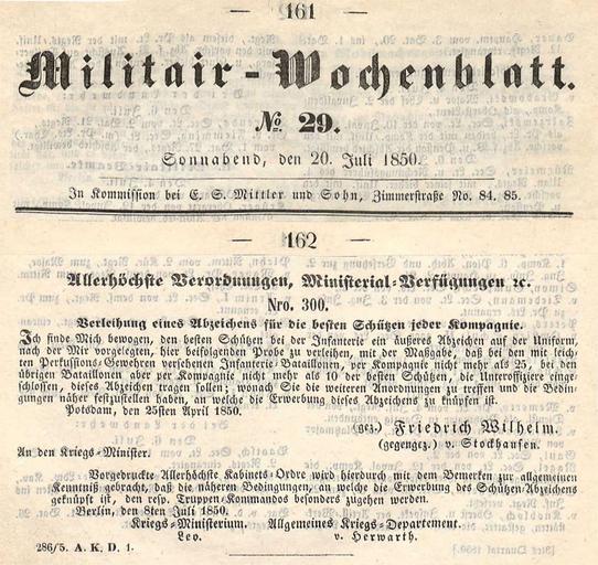 | Keywords: Schuetzenabz1850.jpg en prussain military commander decree journal from 1850 for the infantry shooting-insignia de Preussische Armeeverordnung von 1850 zum Schützenabzeichen der Infanterie Militair-Wochenblatt Nr 29 Author 1850-07-20 Military of the German Empire PD-old |