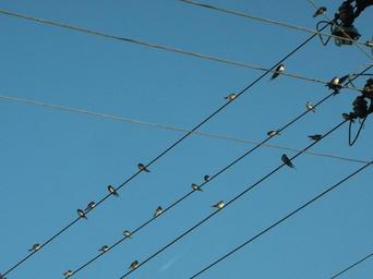 Keywords: Schwalben.jpg de Hirundo rustica Schwalben sammeln sich im Herbst auf Stromleitungen own Straktur 2010-09-05 Vogel Schwalbe Hirundo rustica rustica