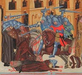 | Keywords: Schweinfurt Dalimil.jpg cs Břetislavovi muži pobíjejí kanovníky ve Schweinfurtu http //www veda cz/dwn/5430/12877B_dalimil jpg Dalimilova kronika anonymous century 14 PD-Art Chronik Dalimil Medieval miniatures of horses Killing in medieval miniature |