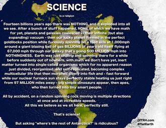 | Keywords: ditrh billions science ditrhbillionsscience nothing vacuum planet mph nuclear complex apes fish dinosaurs religion flatearth memes flat dome firmament yinyang bible truth flatearth.online sun moon curve curvature nocurve nothingvacuumplanetmphnuclearcomplexapesfishdinosaursreligionflatearthmemesflatdomefirmamentyinyangbibletruthflatearthonlinesunmooncurvecurvaturenocurve text Science is a religion. Fourteen billions years ago there was nothing, and it exploded into all we see. After a bunch of stuff happened, none of which we have math for yet, planets and galaxies coalesced in their infinite (but also expanding) vacuum - then our lucky planet formed in the perfect goldilocks position while furiously spinning on a tilted axis at 1,000mph around a giant blazing ball of gas billions of years old itself flying at 67,000mph through out galaxy that's going 500 million mph into nothingness. Earth was just chilling and spinning there for a while before suddenly out of nowhere, with math we don't have yet, inert matter turned into single-celled organisms which for no apparent reason just divided, reorganized, and self-replicated, becoming complex melticellular life that then morphed slowly into fish and - fast forward while our nuclear furnace sun stays perfectly stable heating us just right from 97 million miles away - big simple dinosaurs appear, then apes, who then turned into tiny smart people. All by accident, on random spinning rock moving in multiple directions at once and at incredible speeds. All this we believe as we sit here, perfectly still. That's science! But asking Where's the rest of Antarctica is ridiculous? FlatEarth meme collected by A.J. Wilson of iPressThis at FlatEarth.Online, made by others. Credit to DITRH.com #FlatEarth Science is a religion. Fourteen billions years ago there was nothing, and it exploded into all we see. After a bunch of stuff happened, none of which we have math for yet, planets and galaxies coalesced in their infinite (but also expanding) vacuum - then our lucky planet formed in the perfect goldilocks position while furiously spinning on a tilted axis at 1,000mph around a giant blazing ball of gas billions of years old itself flying at 67,000mph through out galaxy that's going 500 million mph into nothingness. Earth was just chilling and spinning there for a while before suddenly out of nowhere, with math we don't have yet, inert matter turned into single-celled organisms which for no apparent reason just divided, reorganized, and self-replicated, becoming complex melticellular life that then morphed slowly into fish and - fast forward while our nuclear furnace sun stays perfectly stable heating us just right from 97 million miles away - big simple dinosaurs appear, then apes, who then turned into tiny smart people. All by accident, on random spinning rock moving in multiple directions at once and at incredible speeds. All this we believe as we sit here, perfectly still. That's science! But asking Where's the rest of Antarctica is ridiculous? FlatEarth meme collected by A.J. Wilson of iPressThis at FlatEarth.Online, made by others. Credit to DITRH.com #FlatEarth |