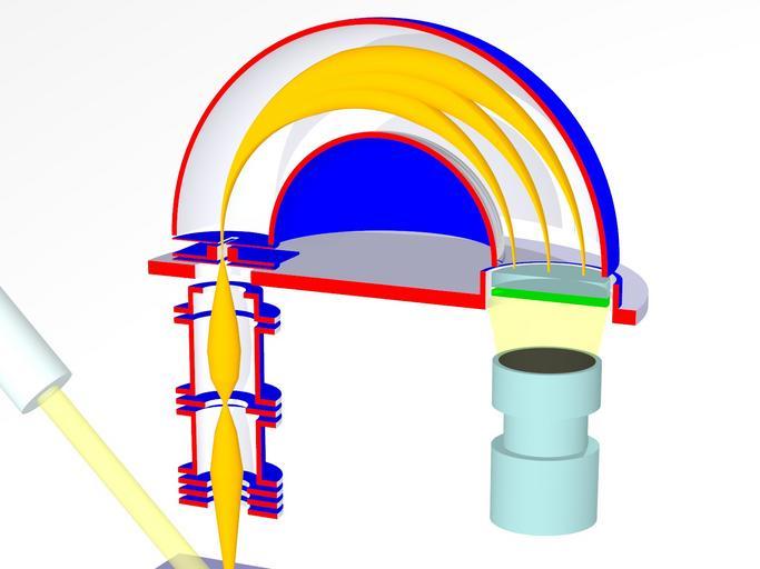 Keywords: Scienta2.jpg Created with Persistence of Vision en path of an electron with 3 different energies in a spherical analyser of a Scienta de Elektronenbahn für Elektronen mit 3 verschiedenen Energien durch einen Kugelanalysator in einem Scienta Own Saiht 2009-06-15 POVray script <pre> // Schnitt durch ein PhotoelectronSpetroskopie Experiment // by Matthias Kreier version 0 8; global_settings assumed_gamma 1 0 default finish ambient 0 6 diffuse 0 4 include colors inc include textures inc camera ultra_wide_angle angle 20 location <35 30 -65> look_at <6 13 0> //plane <0 1 0> -1 pigment color Red //plane <0 0 -1> -50 pigment color White plane <0 1 -1> -2000 pigment color LightGray // Linsensystem zur Fokussierung und Retardierung declare Linsensystem union difference union box <-2 1 3 0 -2 1> <2 1 3 2 2 1> box <-2 1 3 4 -2 1> <2 1 3 6 2 1> box <-2 1 3 8 -2 1> <2 1 4 0 2 1> box <-2 1 6 8 -2 1> <2 1 7 0 2 1> pigment color Blue cylinder < 0 2 9 0 > <0 7 1 0> 0 81 pigment color Silver cylinder < 0 2 9 0 > <0 7 1 0> 2 pigment color Silver inverse difference union cylinder < 0 4 2 0 > <0 4 4 0> 2 1 cylinder < 0 4 3 0 > <0 6 5 0> 1 4 cylinder < 0 6 4 0 > <0 6 6 0> 2 1 cylinder < 0 7 2 0 > <0 7 4 0> 2 1 cylinder < 0 7 3 0 > <0 9 9 0> 1 4 cylinder < 0 9 8 0 > <0 10 0> 2 1 cylinder < 0 10 2 0 > <0 10 4 0> 2 1 cylinder < 0 10 3 0 > <0 11 2 0> 1 4 cylinder < 0 4 1 0 > <0 11 0> 1 2 pigment color Silver cylinder < 0 10 9 0 > <0 11 3 0> 0 8 pigment color Silver cylinder < 0 4 1 0 > <0 11 3 0> 2 pigment color Silver inverse translate <0 1 0> declare Kugelanalysator union intersection // innere Kugel difference sphere <6 14 0> 4 2 texture Polished_Chrome sphere <6 14 0> 4 pigment color Blue box <1 14 -1> <11 19 5> pigment color Red intersection // äußere Kugel difference sphere <6 14 0> 8 pigment color Blue sphere <6 14 0> 7 8 pigment color Silver box <-3 14 -1> <15 23 9> pigment color Red difference // Herzog-Platte cylinder < 6 12 5 0 > < 6 13 0 > 9 pigment color LightSteelBlue cylinder < 0 12 4 0> <0 13 1 0> 1 1 pigment color Silver cylinder < 12 12 4 0> <12 13 1 0> 2 3 difference cylinder < 12 12 5 0 > < 12 13 8 0 > 2 4 pigment color Blue cylinder < 12 12 4 0> < 12 13 9 0> 2 2 pigment color Silver intersection // Eingangsspalte union box <-2 13 25 -2> <2 13 35 2> pigment color Blue box <-0 6 13 3 -2> <0 6 13 75 2> pigment color Blue box <-0 2 13 2 -2 1> <0 2 14 1 2 1> pigment color Silver inverse intersection // Eingangsblenden union cylinder < 0 13 85 0 > < 0 13 9 0 > 2 pigment color Blue cylinder < 0 13 1 0 > < 0 13 15 0 > 2 pigment color Blue box <-0 15 13 0 -1> <0 15 14 1 1> pigment color Silver inverse declare Optik union object Linsensystem pigment color Blue object Kugelanalysator rotate<0 0 0> declare Scienta union intersection // Linsensystem und Analysator entlang x aufgeschnitten object Optik box <-3 2 0> <15 23 9> pigment color Red intersection //aufgeschnitten union cylinder <12 13 3 0> <12 13 8 0> 2 pigment color CadetBlue // Channelplate cylinder <12 13 0 0> <12 13 2 0> 2 pigment color Green // Phosphorplatte box <9 10 0> <15 15 9> pigment color rgbf <1 1 1 1> difference // CCD Kamera cylinder <12 9 5 0> <12 11 0> 1 8 pigment color CadetBlue cylinder <12 10 0> <12 11 1 0> 1 6 pigment color Black cylinder <12 9 6 0> <12 8 0> 1 4 pigment color CadetBlue cylinder <12 8 1 0> <12 5 5 0> 1 8 pigment color CadetBlue cone <12 11 0> 1 6 <12 12 95 0> 2 texture pigment rgbf<1 1 0 7 0 97> // Weg der Elektronen declare Elektron1 union intersection // Normales Elektron Passenergie intersection torus 6 0 5 rotate<-3 8 0 0> translate <0 0 46 0> torus 6 0 5 rotate< 3 8 0 0> translate <0 -0 46 0> torus 6 0 7 translate <-0 67 0 0> torus 6 0 7 translate < 0 67 0 0> rotate<90 0 0> translate<6 14 0> box <-2 14 -2> <13 23 2> intersection // Energie kleiner als Epass intersection torus 6 0 5 rotate<-3 8 0 0> translate <0 0 46 0> torus 6 0 5 rotate< 3 8 0 0> translate <0 -0 46 0> torus 6 0 7 translate <-0 67 0 0> torus 6 0 7 translate < 0 67 0 0> rotate<90 0 0> scale 0 9 translate<5 4 14 0> box <-2 14 -2> <13 23 2> intersection // Energie größer als Epass intersection torus 6 0 5 rotate<-3 8 0 0> translate <0 0 46 0> torus 6 0 5 rotate< 3 8 0 0> translate <0 -0 46 0> torus 6 0 7 translate <-0 67 0 0> torus 6 0 7 translate < 0 67 0 0> rotate<90 0 0> scale 1 1 translate<6 6 14 0> box <-2 14 -2> <15 23 2> cone < 0 0 0 > 0 <0 5 5 0> 0 6 cone < 0 5 5 0 > 0 6 <0 7 0> 0 4 cone < 0 7 0 > 0 4 <0 8 2 0> 0 03 cone < 0 8 0 > 0 03 <0 9 0> 0 5 cone < 0 9 0 > 0 5 <0 10 0> 0 6 cone < 0 10 0 > 0 6 <0 11 0> 0 5 cone < 0 11 0 > 0 5 <0 13 5> 0 02 cone < 0 13 5 0> 0 02 <0 14 0> 0 05 // cone < 0 11 0 > 0 2 <0 14 1 0> 0 05 // cylinder < 0 5 0 > <0 11 0> 0 2 // cone < 0 0 0 > 0 <0 5 0> 0 2 declare Lichtquelle union cylinder <-18 18 0> <1 -1 0> 0 5 texture pigment rgbf<1 1 0 6 0 7> difference cylinder <-7 5 7 5 0> <-40 40 0> 1 2 cylinder <-7 4 7 4 0> <-20 20 0> 0 5 pigment color LightBlue declare Sample union box <-4 8 -0 5 -4 8> <4 8 0 4 8> pigment color RichBlue cylinder < 0 -1 0 > < 0 -2 0> 1 pigment color Green // alles zusammenbauen object Scienta object Elektron1 pigment color Orange object Lichtquelle object Sample // Lichtquellen light_source <12 18 -200> color White light_source // <0 26 -20> <35 30 -65> color White light_source // Rückseite beleuchten <20 30 10> color White / light_source <-60 28 -200> color White light_source // <0 26 -20> // <30 30 -45> <20 30 -65> color White light_source <20 30 10> color White // Rückseite beleuchten light_source // Kugel innen Licht <9 21 1 5> color White / </pre> Photoemission spectroscopy |