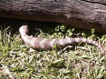 | Keywords: Scincidae Aus Zoo Aug06.JPG Photo of a lizard unknown w Scincidae with part of head obscured by the shadow of a log Either Tiliqua scincoides or w Cyclodomorphus gerrardii Taken by Andjam on August 3 2006 at w Australia Zoo Queensland Australia 2006-08-03 own assumed Andjam Unidentified Scincidae |