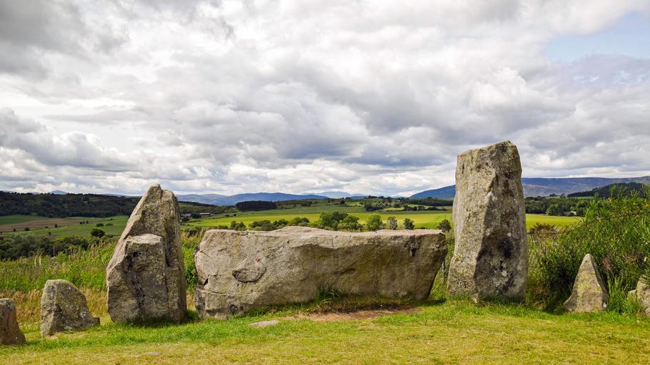 Keywords: scotland aberdeenshire dee-tal stone circle old historically mystical sky clouds meadow landscape