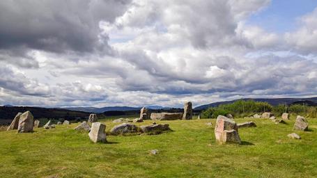 Keywords: scotland aberdeenshire dee-tal stone circle old historically mystical sky clouds meadow landscape