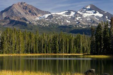 Keywords: scott lake mountains sisters reflection calm landscape scenic park range peaceful water forest trees picturesque willamette national forest oregon usa snow peaks