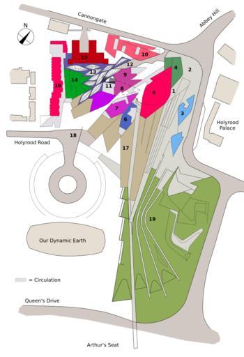 | Keywords: Scottish Parliament site plan.svg Site plan of the Scottish Parliament<br> <small> 1 Public Entrance 2 Plaza 3 Pond 4 Press Tower 5 Debating Chamber 6 Tower one 7 Tower two 8 Tower three 9 Tower four 10 Tower five Cannongate Bldg 11 Main Staircase 12 MSP's Entrance 13 Lobby 14 Garden 15 Queensbery House 16 MSP building 17 Turf roof 18 Carpark and vehiclular entrance 19 Landscaped park Inkscape </small> Own 19 20 8 September 2007 UTC Russ McGinn converted to SVG by DTR PD Image Scottish_Parliament_site_plan jpg Scottish Parliament Building SVG site plans |