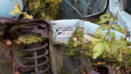 Keywords: scrap metal rusty lorn mossy guide spring in the woods car forgotten