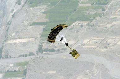 | Keywords: Screamer 2K, Joint Precision Air Drop System DVIDS29496.jpg en OVER AFGHANISTAN - The new GPS guided Screamer 2K bundle Joint Precision Air Drop System floats to the ground after being dropped from the back of a C-130 Hercules over Afghanistan Aug 26 2006 The drop was made from 17 500 feet above mean sea level and was the first joint Air Force/Army operational drop of JPADS in the Central Command Area of Responsibility Four bundles were dropped from the Alaska Air National Guard C-130 The system is designed to provide precision airdrops from high altitudes elimination the treat of small arms fire All four bundles arrived at the drop zone re-supplying Army troops on the ground with ammunition and water U S Air Force photo/Senior Airman Brian Ferguson 2006-08-31 https //www dvidshub net/image/29496 29496 2006-09-08 13 25 AF PD-USGov Lockheed C-130 Hercules Images from DoD uploaded by Fæ |
