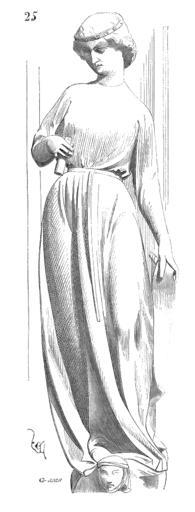 Keywords: Sculpture.cathedrale.Strasbourg.png Il est quelques statues de la cathédrale de Strasbourg qui sont des œuvres capitales; les deux statues de l'Église et de la Synagogue placées à la porte Sud et qui sont du commencement du XIII<sup>e</sup> siècle sont remarquablement belles Plusieurs des statues des vierges sages et folles de la porte droite de la façade occidentale datant de la fin du XIII<sup>e</sup> siècle sont des chefs-d'œuvre On en pourra juger par l'exemple que nous donnons ici fig 25 Ces statues grande nature taillées dans du grès rouge sont d'une exécution excellente et la plupart ont une très-belle tournure Ces artistes rhénans comme leurs confrères de l'Île-de-France de la Champagne de la Bourgogne de la Picardie s'inspiraient d'ailleurs des types qu'ils avaient sous les yeux Ce ne sont plus là les physionomies que nous retrouvons à Paris à Reims ou à Amiens mais bien le type alsacien Malheureusement beaucoup de ces statues ou bas-reliefs de la cathédrale de Strasbourg ont été refaits à diverses époques car jamais on n'a cessé de travailler à cet édifice Une statue un bas-relief étaient-ils détériorés par le temps ou la main des hommes on les remplaçait Il ne faut donc pas s'en rapporter pour porter un jugement sur l'école de sculpteurs des XIII<sup>e</sup> et XIV<sup>e</sup> siècles de Strasbourg à l'ensemble des exemples que nous montre la cathédrale mais discerner au milieu de ces restaurations successives les ouvrages qui réellement appartiennent au beau moment de cette école Viollet-le-Duc Drawings by Eugène Viollet-le-Duc Gothic statues of Notre-Dame de Strasbourg Viollet Statues of Notre-Dame de Strasbourg Outside Viollet |