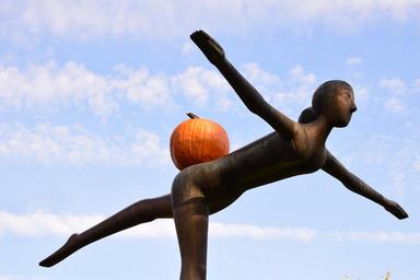 Keywords: sculpture fly funny pumpkin bronze woman art hoax sport acrobatics athletics poor forward autumn sky
