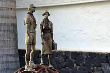 Keywords: sculpture the form of figurines metal agatha christie novel inspiration tenerife spain closeup brown tourism