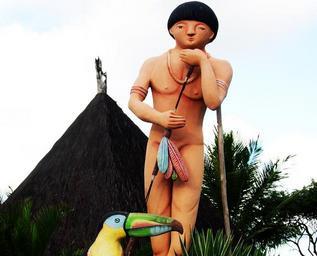Keywords: sculpture indian brazil tucano nature man bahia sky clouds landscape colorful naked loud
