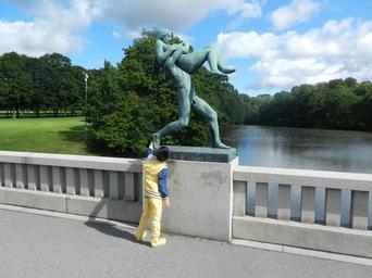 Keywords: sculpture run hold back art boy tourist small bridge park river monument