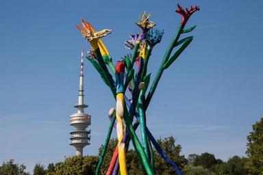 Keywords: sculpture statue wood painted flowers colorful tv tower