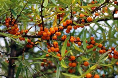 Keywords: sea buckthorn fruits berries orange red bush rowanberries evergreen bush periwinkle ornamental shrub hedge birds bosk ornamental