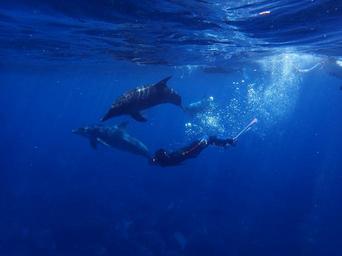 Keywords: sea dolphin blue in water diving animal people swimming together