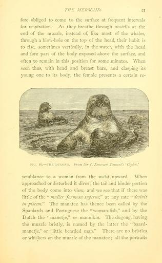 | Keywords: Sea fables explained (15584909821).jpg THE MERMAID <br> 43 <br> fore obliged to come to the surface at frequent inter\-als <br> for respiration As they breathe through nostrils at the <br> end of the muzzle instead of like most of the whales <br> through a blow-hole on the top of the head their habit is <br> to rise sometimes vertically in the water with the head <br> and fore part of the body exposed above the surface and <br> often to remain in this position for some minutes When <br> seen thus with head and breast bare and clasping its <br> young one to its body the female presents a certain re- <br> FIG i6 ” THE DUGONG Fvom Sir J Emcrsoii Tcnucnt's ' – dylon <br> semblance to a woman from the waist upward When <br> approached or disturbed it dives ; the tail and hinder portion <br> of the body come into view and we see that if there was <br> little of the inulier fonnosa siepcrjie at any rate dcsinit <br> in piscem ' The manatee has thence been called by the <br> Spaniards and Portuguese the woman-fish and by the <br> Dutch the manetje or mannikin The dugong having <br> the muzzle bristly is named b\- the latter the baard- <br> manetje or little bearded man There are no bristles <br> or whiskers on the muzzle of the manatee ; all the portraits 10985626 41337 10456 Page 43 Text http //www biodiversitylibrary org/page/10985626 1883 10 5962/bhl title 10456 International Fisheries Exhibition; Lee Henry Biodiversity Heritage Library Sea fables explained Mermaids Monsters Are Real Folklore Ocean Smithsonian Libraries bhl page 10985626 dc identifier http //biodiversitylibrary org/page/10985626 bhlMonstersRreal Halloween dugong smithsonian libraries bhlmonstersrreal halloween Information field Flickr posted date ISOdate 2014-10-21 CC-BY-2 0 BioDivLibrary https //flickr com/photos/61021753 N02/15584909821 2015-08-25 17 56 29 cc-by-2 0 PD-old-70-1923 Dugong Sea fables explained Photos uploaded from Flickr by Fæ using a script |