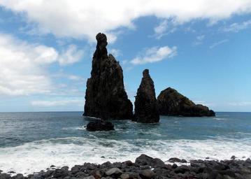 Keywords: sea island atlantic rock cliff ocean wave spray beach stone beach holiday flower island madeira sky cloudy summer portugal water waters