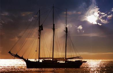 Keywords: sea lake water ocean ship sailing vessel sky clouds sunset lighting nature landscape digital painting painting